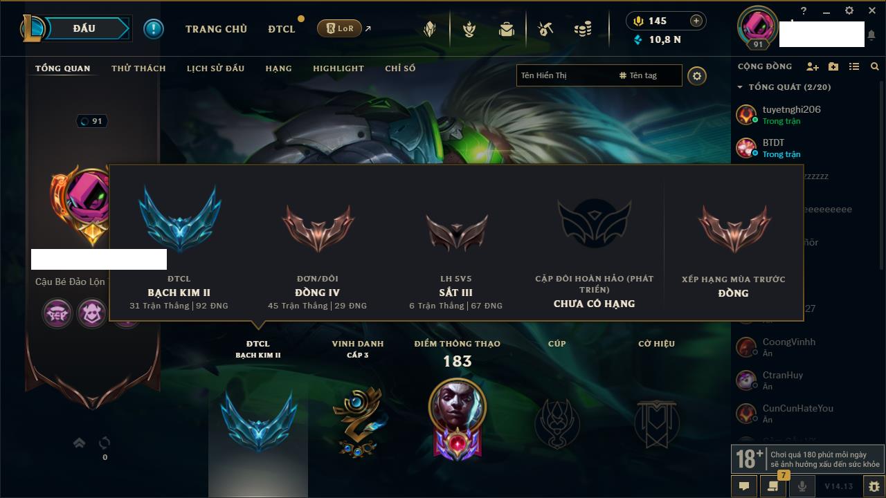 Rank Đơn: Chưa rank mùa nàoKhung: Chưa có khungTướng: 2 - Còn 9000 THXTrang Phục: 0Rank ĐTCL: Bạch Kim IIILinh Thú: 31