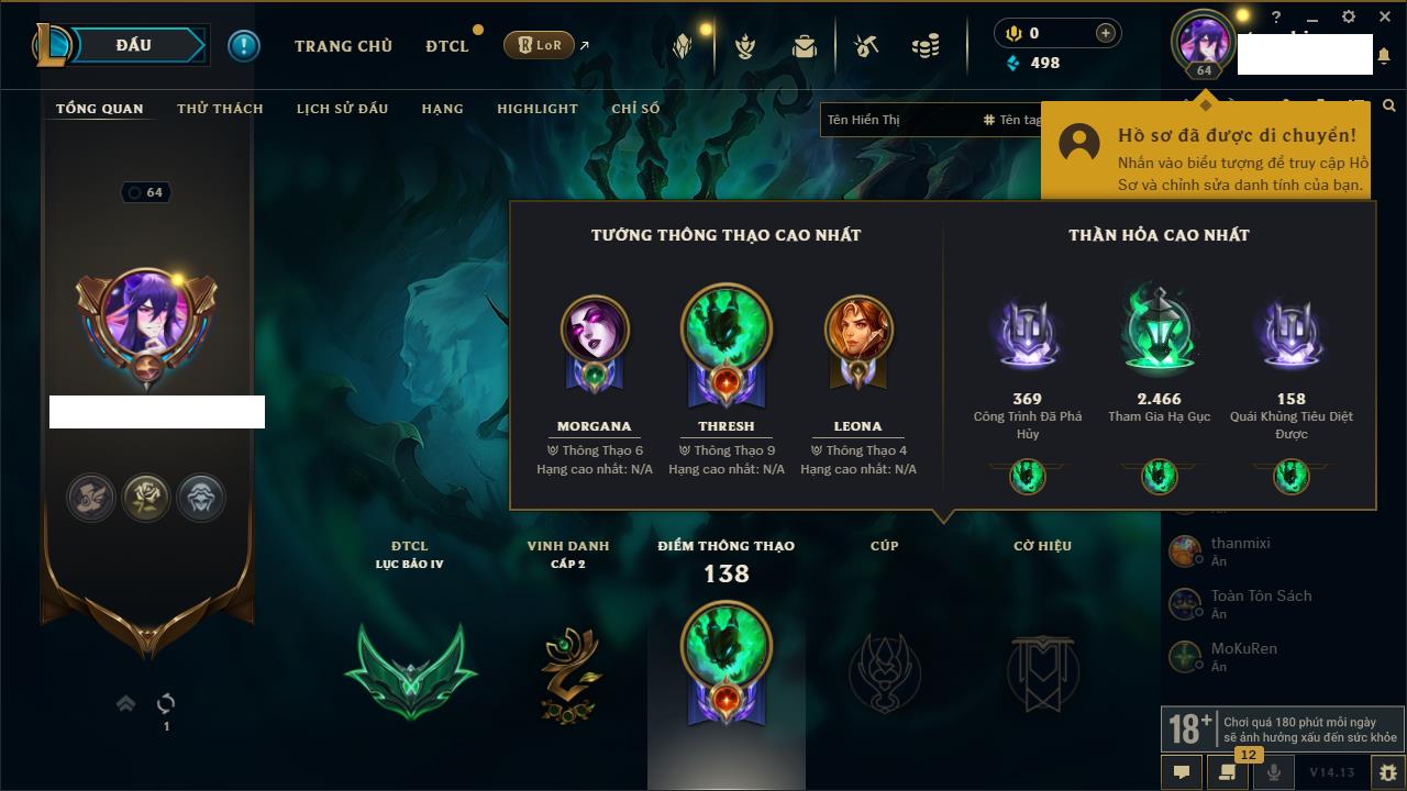 Rank Đơn: Bạc IVKhung: VàngTướng: 172 - Còn 358384 THXTrang Phục: 177Rank ĐTCL: Lục Bảo IILinh Thú: 211