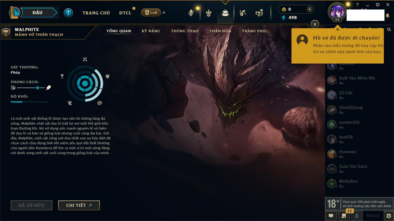 Rank Đơn: Vàng IVKhung: VàngTướng: 171 - Còn 48721 THXTrang Phục: 171Rank ĐTCL: Chưa RankLinh Thú: 27