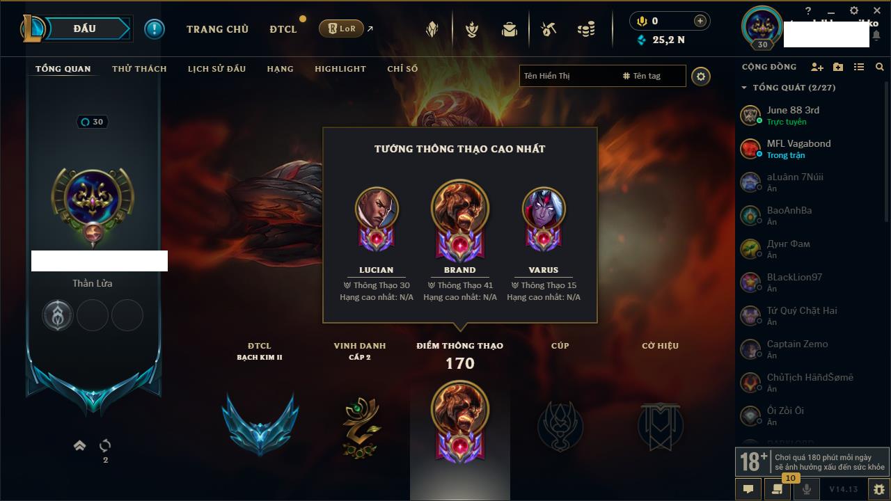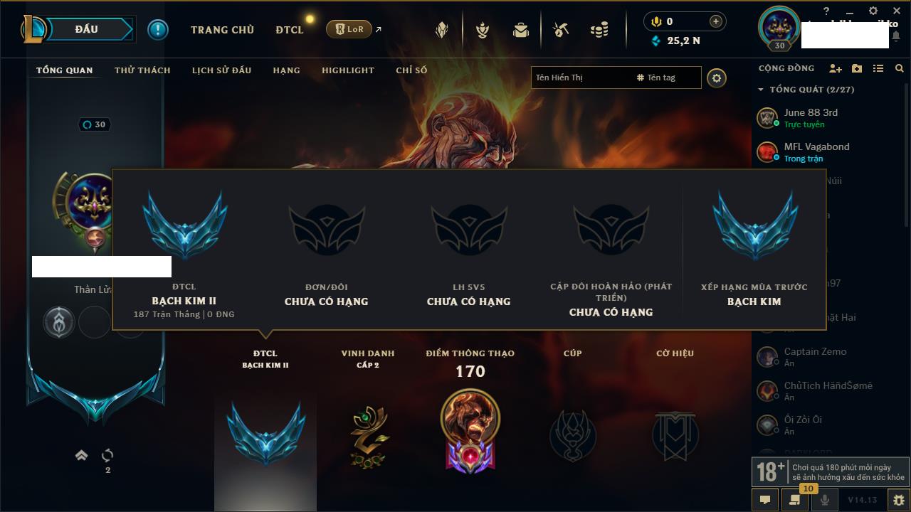 Rank Đơn: Chưa rank mùa nàoKhung: Chưa có khungTướng: 3 - Còn 32650 THXTrang Phục: 0Rank ĐTCL: Bạch Kim IVLinh Thú: 66