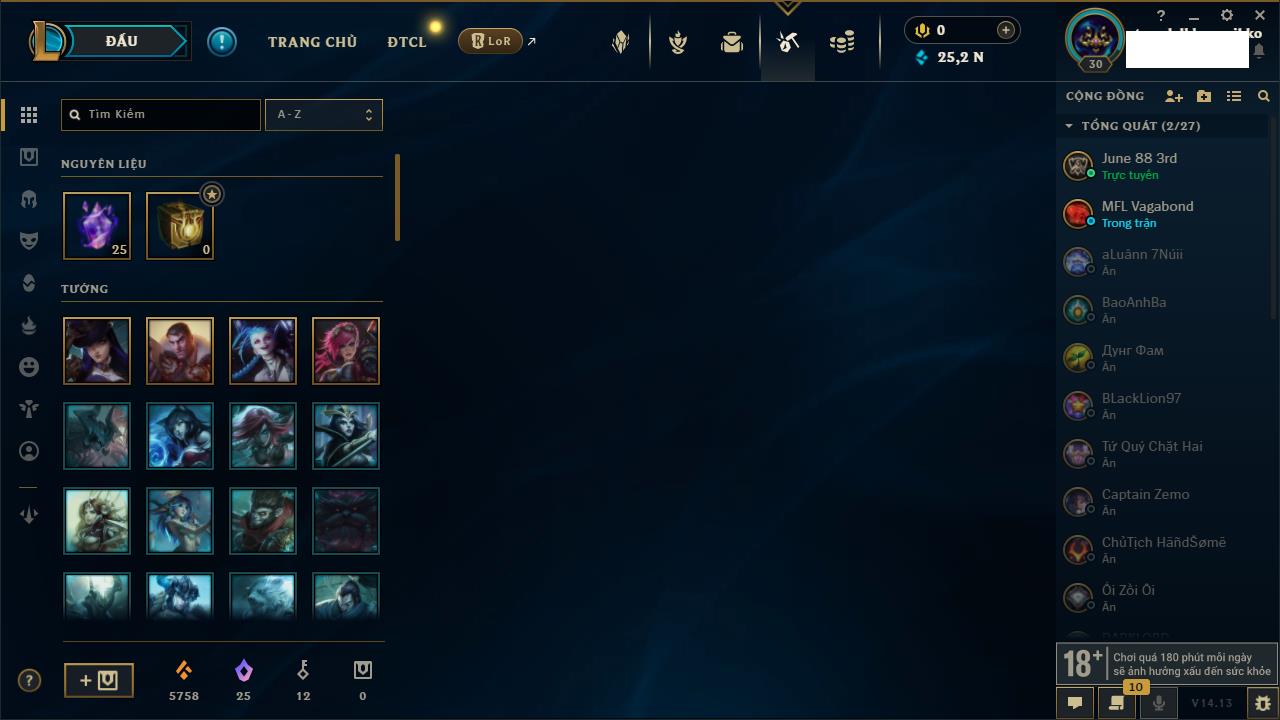 Rank Đơn: Chưa rank mùa nàoKhung: Chưa có khungTướng: 3 - Còn 34550 THXTrang Phục: 0Rank ĐTCL: Bạch Kim IVLinh Thú: 41