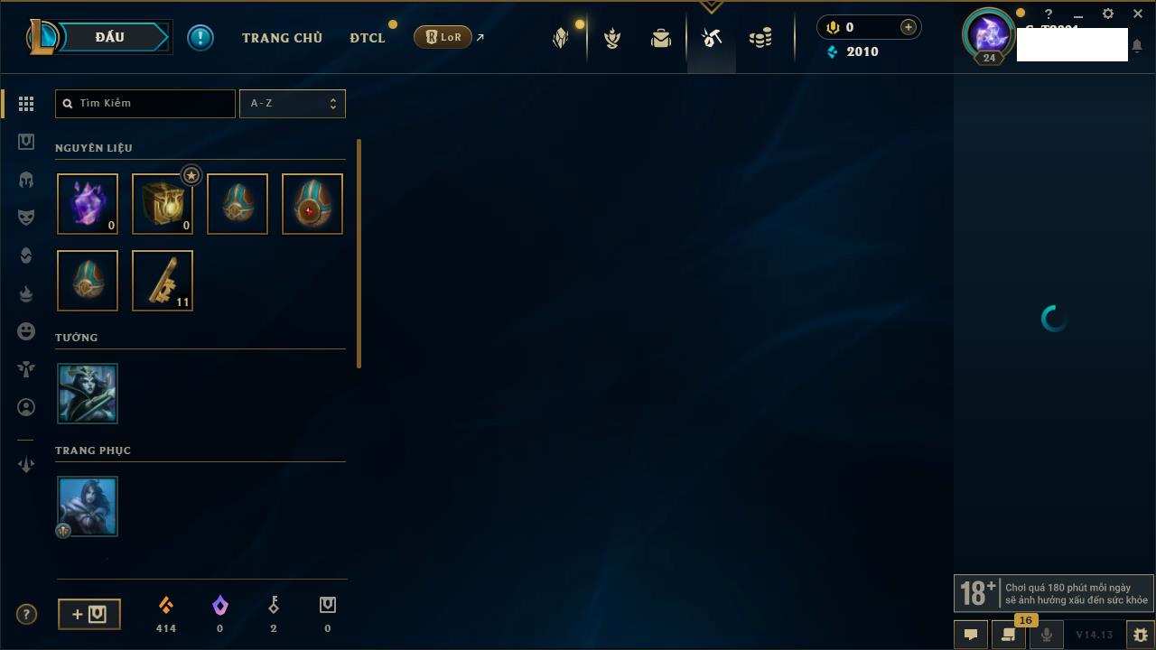 Rank Đơn: Chưa rank mùa nàoKhung: Chưa có khungTướng: 2 - Còn 9000 THXTrang Phục: 0Rank ĐTCL: Bạch Kim IIILinh Thú: 31