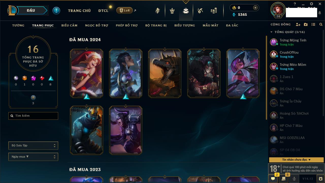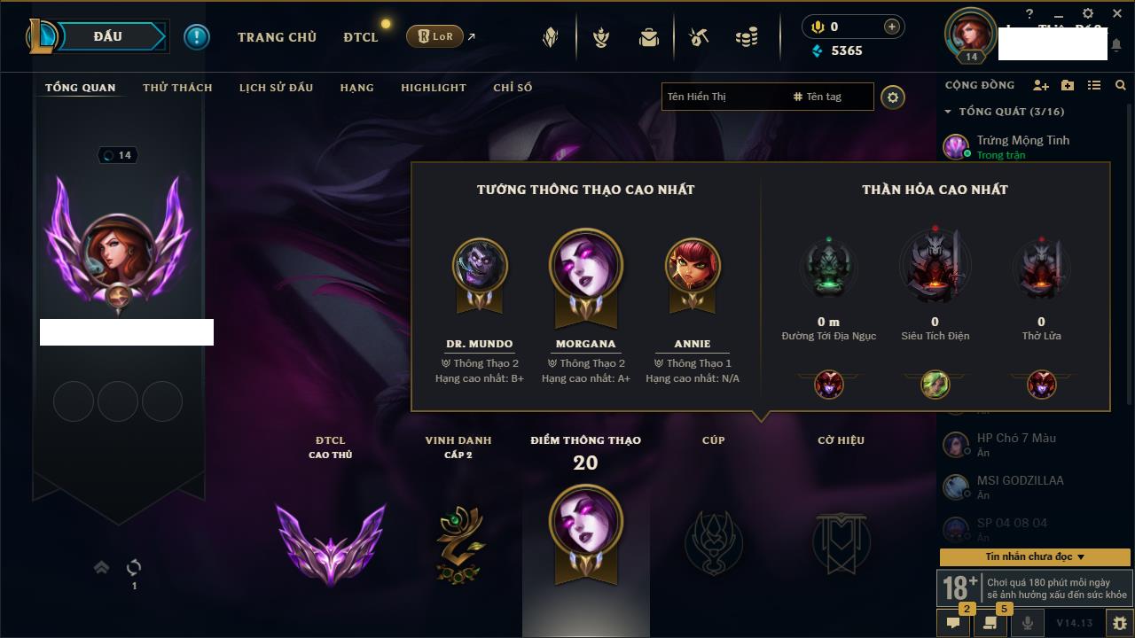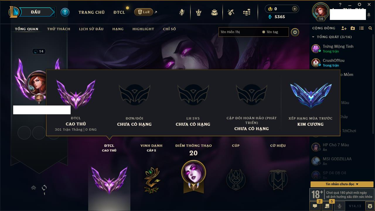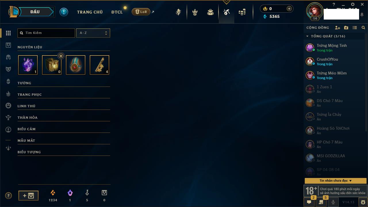 Rank Đơn: Chưa Rank Khung: Chưa có khung Tướng: 157 - Còn 51905 THX Trang Phục: 3 Rank ĐTCL: Chưa Rank Linh Thú: 175