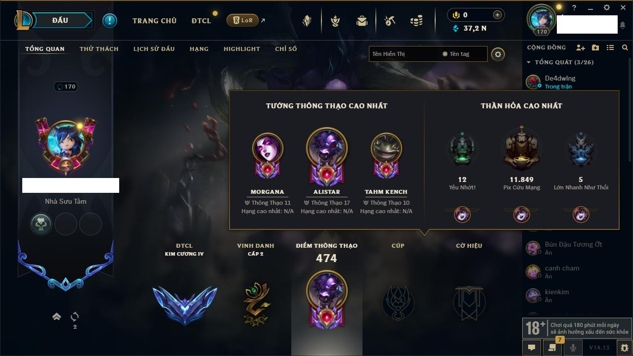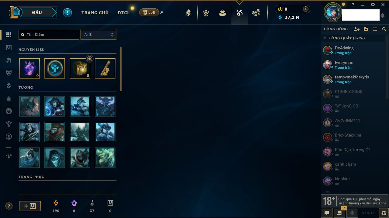 Rank Đơn: Chưa RankKhung: Chưa có khungTướng: 157 - Còn 6783 THXTrang Phục: 50Rank ĐTCL: Chưa RankLinh Thú: 37