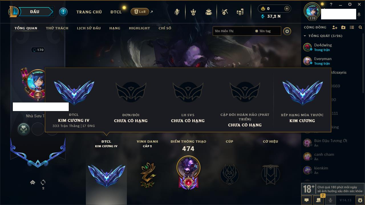 Rank Đơn: Vàng IIIKhung: VàngTướng: 170 - Còn 33222 THXTrang Phục: 136Rank ĐTCL: Chưa RankLinh Thú: 40