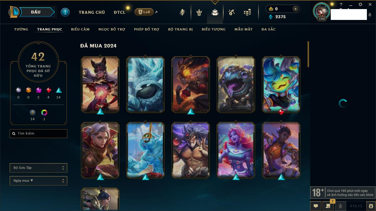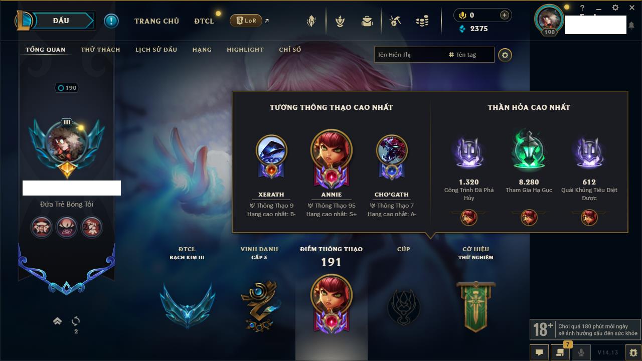 Rank Đơn: Bạc IVKhung: VàngTướng: 172 - Còn 358384 THXTrang Phục: 177Rank ĐTCL: Lục Bảo IILinh Thú: 211