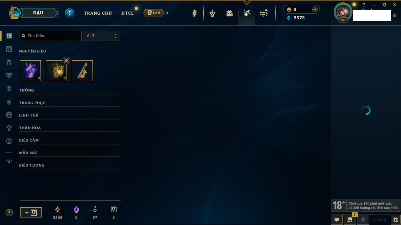 Rank Đơn: Vàng IVKhung: BạcTướng: 171 - Còn 231097 THXTrang Phục: 180Rank ĐTCL: Vàng IVLinh Thú: 110