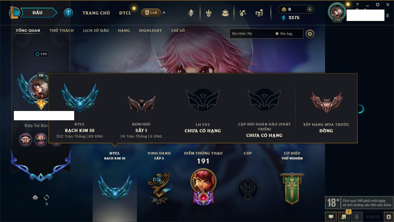 Rank Đơn: Bạc IIKhung: VàngTướng: 171 - Còn 332462 THXTrang Phục: 165Rank ĐTCL: Kim Cương IVLinh Thú: 181