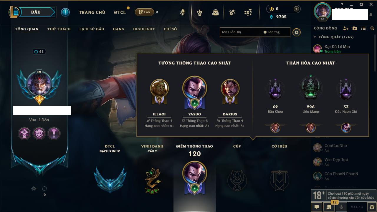 Rank Đơn: Bạch Kim IVKhung: Bạch kimTướng: 171 - Còn 54021 THXTrang Phục: 327Rank ĐTCL: Chưa RankLinh Thú: 115