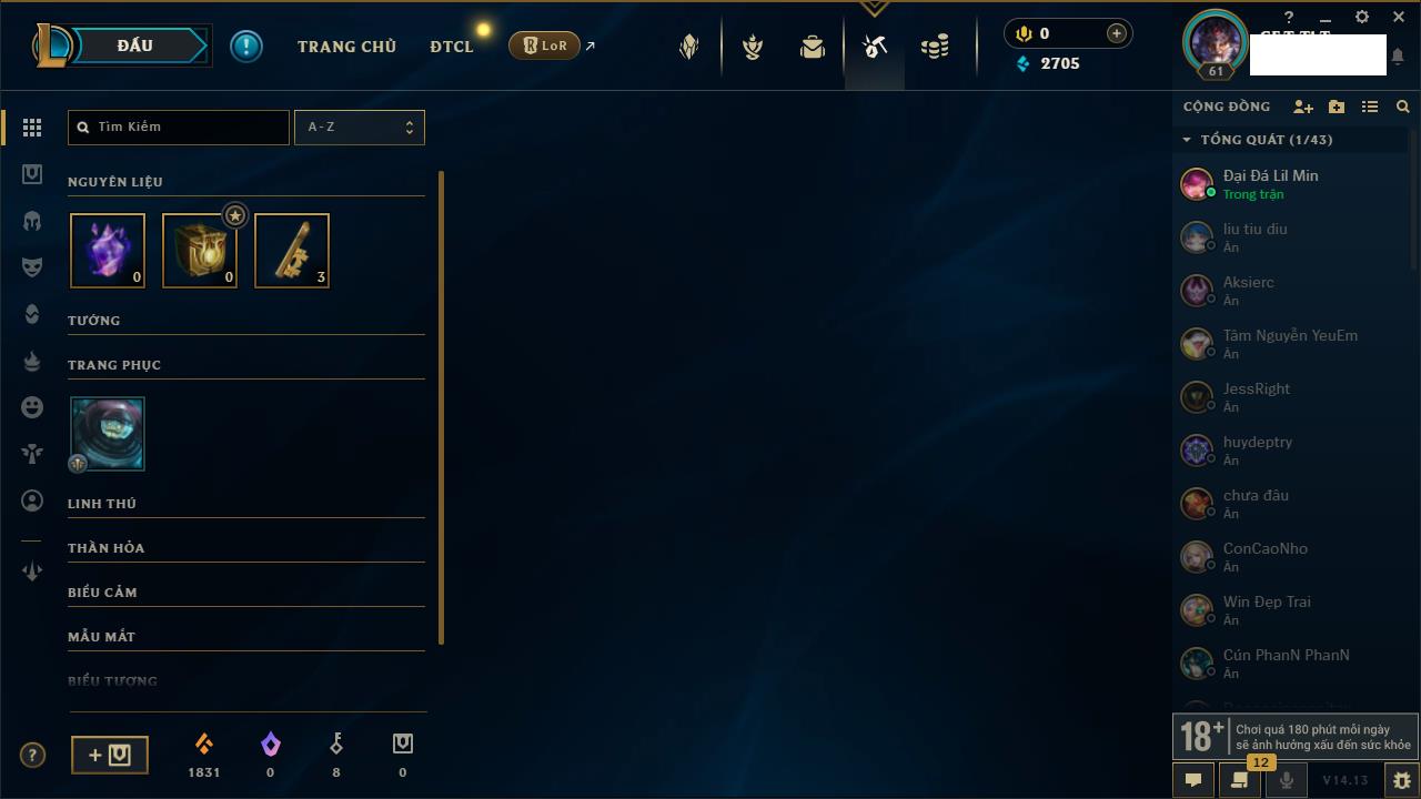 Rank Đơn: Vàng IKhung: BạcTướng: 171 - Còn 60584 THXTrang Phục: 286Rank ĐTCL: Vàng IIILinh Thú: 117