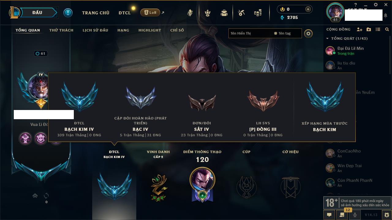 Rank Đơn: Bạch Kim IIKhung: Bạch kimTướng: 171 - Còn 141298 THXTrang Phục: 274Rank ĐTCL: Bạch Kim IILinh Thú: 188