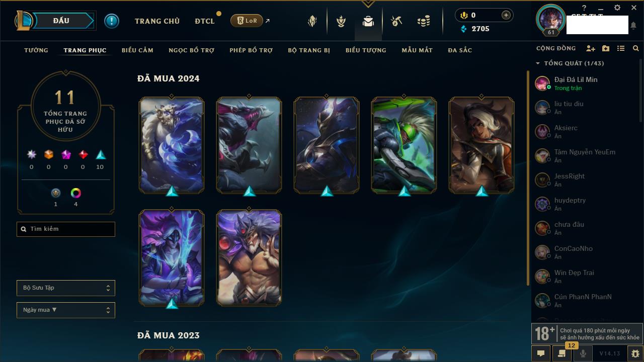 Rank Đơn: Vàng IIIKhung: VàngTướng: 171 - Còn 88128 THXTrang Phục: 329Rank ĐTCL: Chưa RankLinh Thú: 41