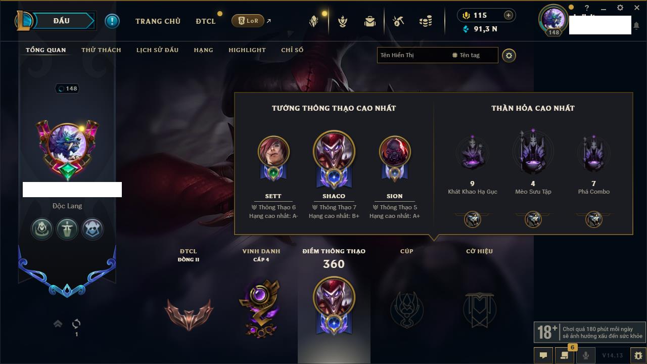 Rank Đơn: Bạch Kim IVKhung: Bạch kimTướng: 171 - Còn 154285 THXTrang Phục: 169Rank ĐTCL: Bạch Kim IILinh Thú: 60