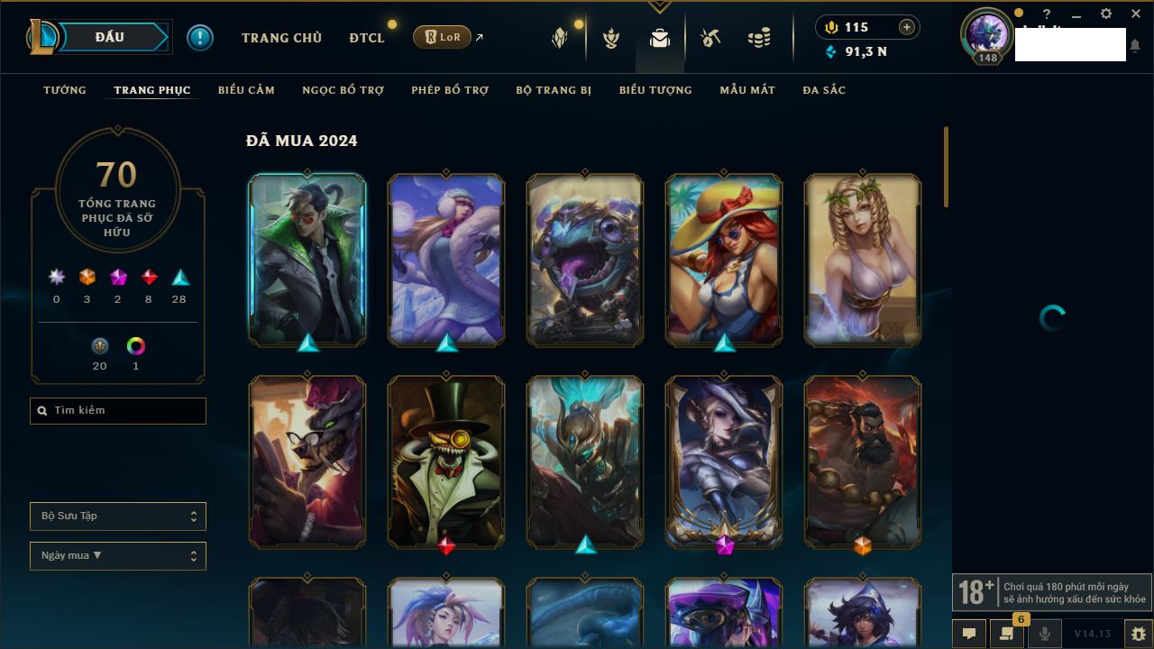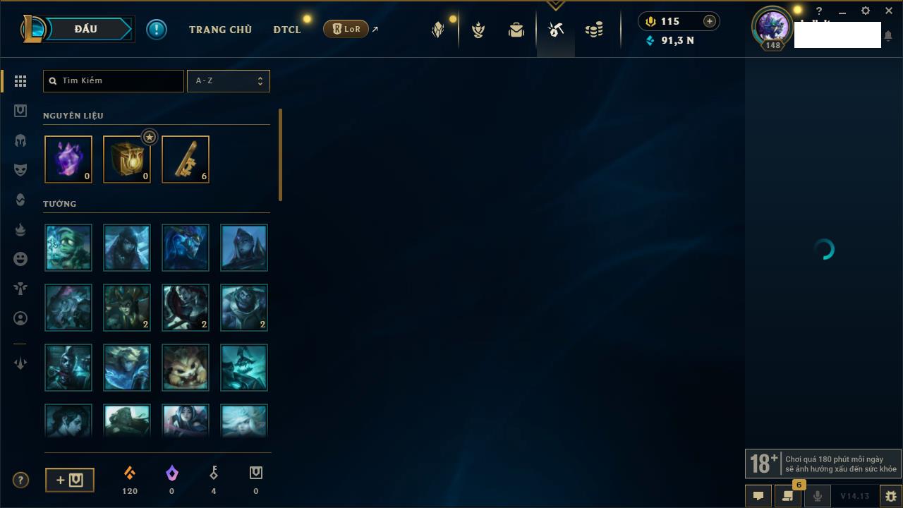 Rank Đơn: Vàng IVKhung: BạcTướng: 171 - Còn 426239 THXTrang Phục: 162Rank ĐTCL: Chưa RankLinh Thú: 33
