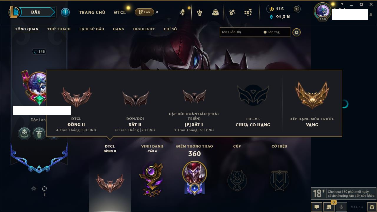 Rank Đơn: Bạc IIKhung: VàngTướng: 171 - Còn 332462 THXTrang Phục: 165Rank ĐTCL: Kim Cương IVLinh Thú: 181