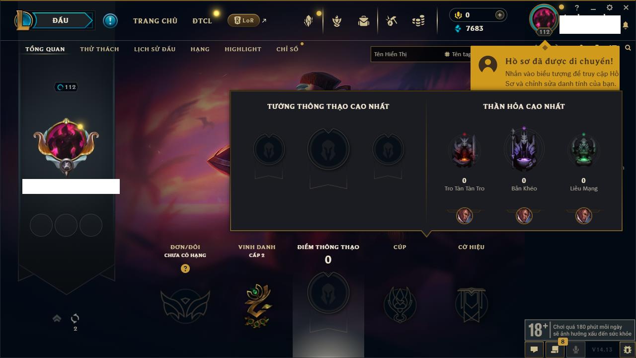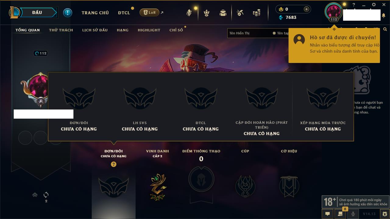 Rank Đơn: Chưa RankKhung: Chưa có khungTướng: 118 - Còn 13712 THXTrang Phục: 117Rank ĐTCL: Chưa RankLinh Thú: 34
