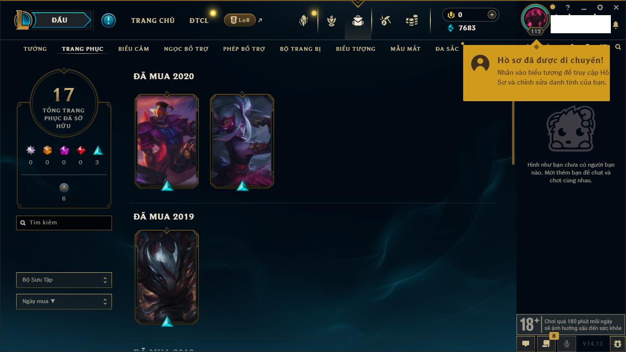 Rank Đơn: Chưa RankKhung: Chưa có khungTướng: 165 - Còn 3214 THXTrang Phục: 160Rank ĐTCL: Chưa RankLinh Thú: 28