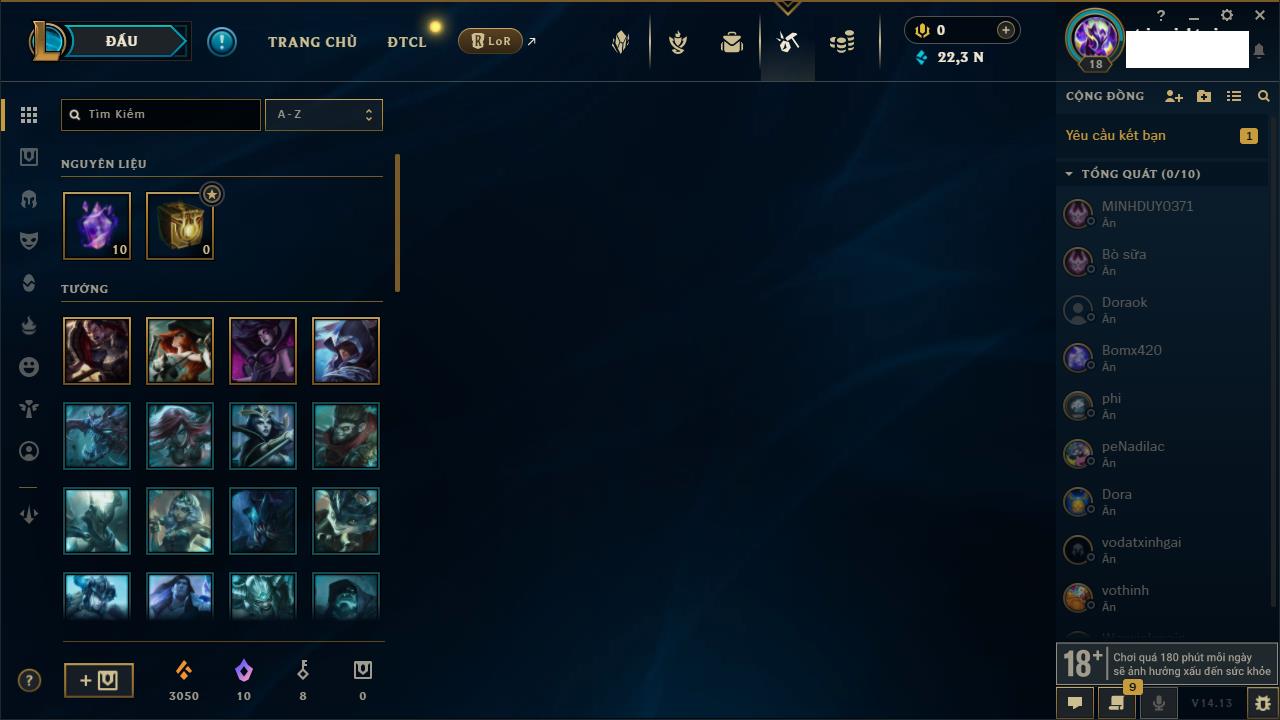Rank Đơn: Chưa RankKhung: Chưa có khungTướng: 37 - Còn 27387 THXTrang Phục: 10Rank ĐTCL: Chưa RankLinh Thú: 1