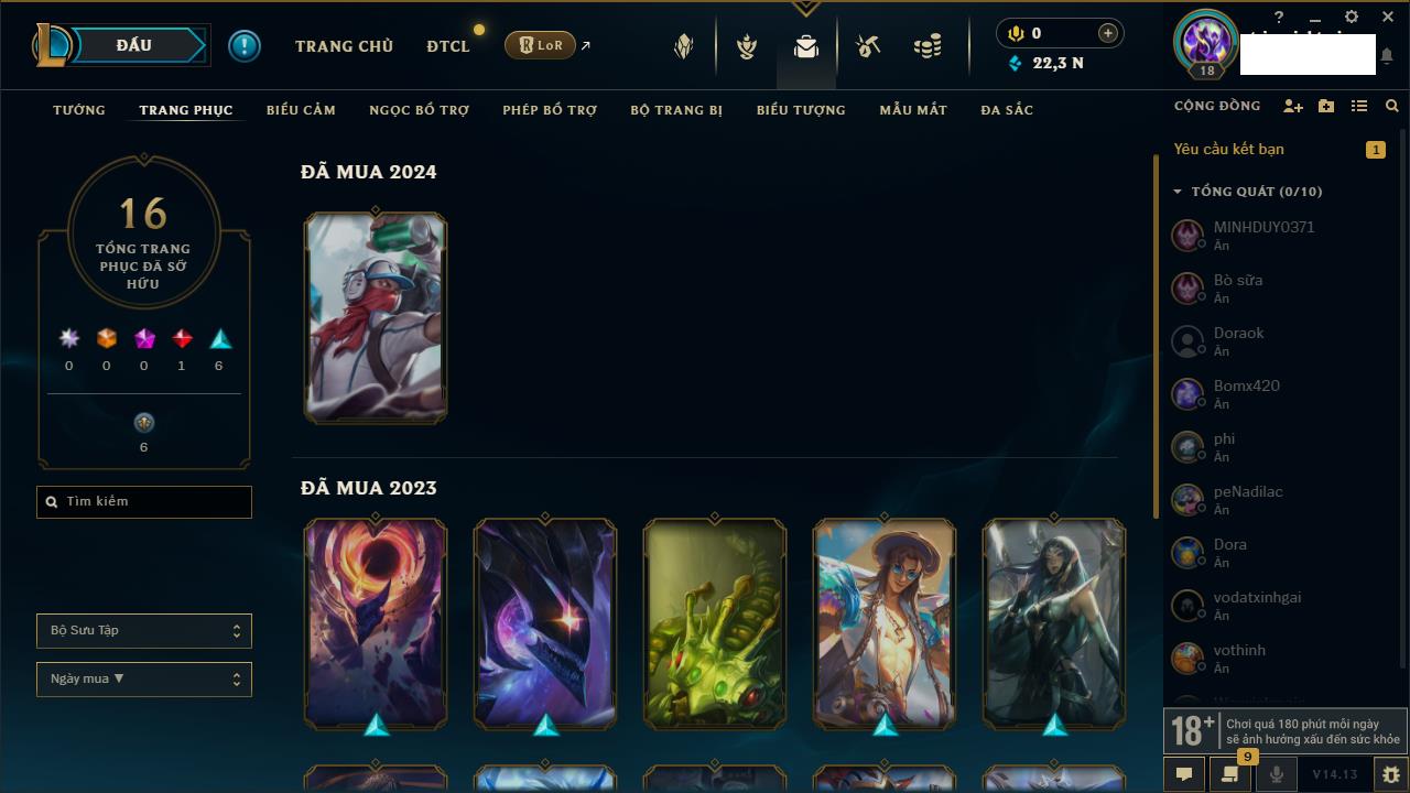 Rank Đơn: Chưa RankKhung: Chưa có khungTướng: 165 - Còn 3214 THXTrang Phục: 160Rank ĐTCL: Chưa RankLinh Thú: 28