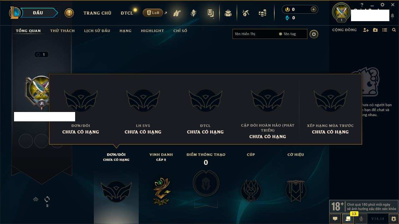 Rank Đơn: Chưa rank mùa nàoKhung: Chưa có khungTướng: 0 - Còn 600 THXTrang Phục: 0Rank ĐTCL: Chưa RankLinh Thú: 19