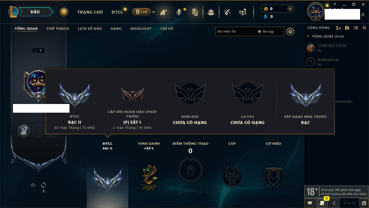 Rank Đơn: Chưa rank mùa nàoKhung: Chưa có khungTướng: 0 - Còn 0 THXTrang Phục: 0Rank ĐTCL: Chưa RankLinh Thú: 9