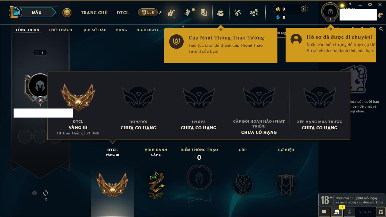 Rank Đơn: Chưa rank mùa nàoKhung: Chưa có khungTướng: 0 - Còn 0 THXTrang Phục: 0Rank ĐTCL: Chưa RankLinh Thú: 6
