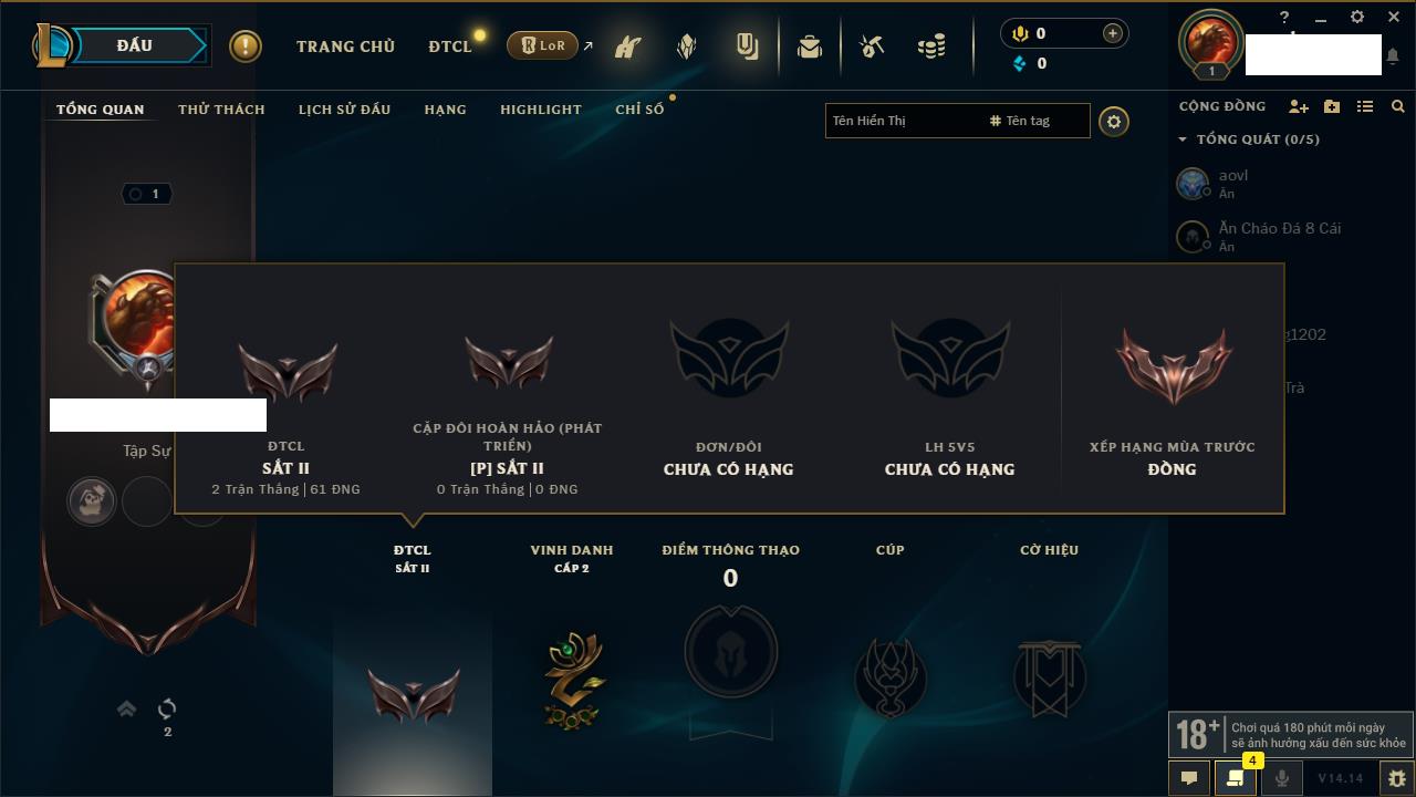 Rank Đơn: Chưa rank mùa nàoKhung: Chưa có khungTướng: 0 - Còn 0 THXTrang Phục: 0Rank ĐTCL: Chưa RankLinh Thú: 4