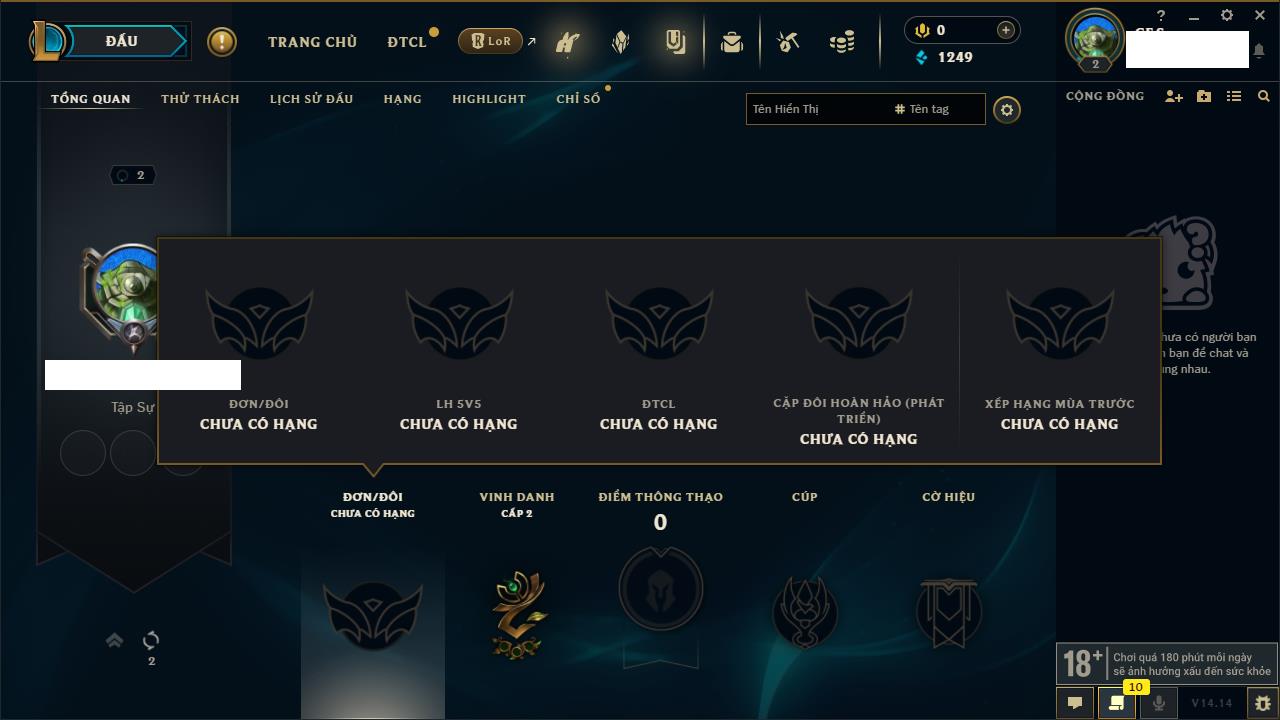 Rank Đơn: Chưa rank mùa nàoKhung: Chưa có khungTướng: 0 - Còn 6299 THXTrang Phục: 0Rank ĐTCL: Chưa RankLinh Thú: 8