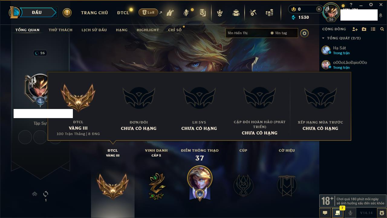 Rank Đơn: Chưa rank mùa nàoKhung: Chưa có khungTướng: 0 - Còn 6300 THXTrang Phục: 0Rank ĐTCL: Bạc IIILinh Thú: 3
