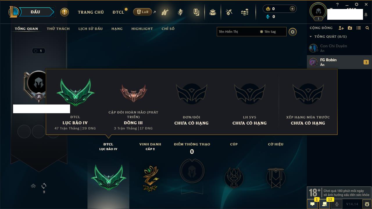 Rank Đơn: Chưa rank mùa nàoKhung: Chưa có khungTướng: 0 - Còn 0 THXTrang Phục: 0Rank ĐTCL: Chưa RankLinh Thú: 6