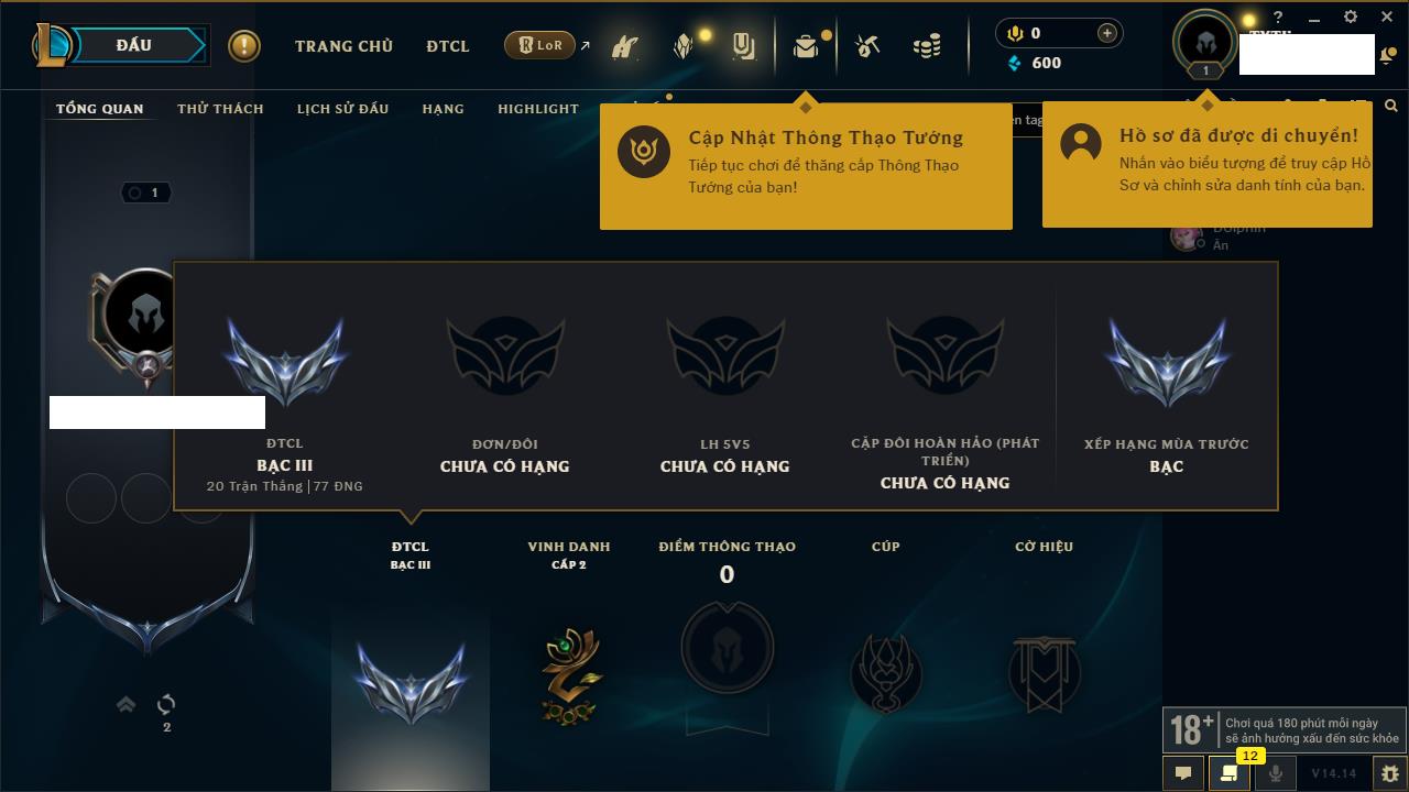 Rank Đơn: Chưa rank mùa nàoKhung: Chưa có khungTướng: 0 - Còn 600 THXTrang Phục: 0Rank ĐTCL: Chưa RankLinh Thú: 19