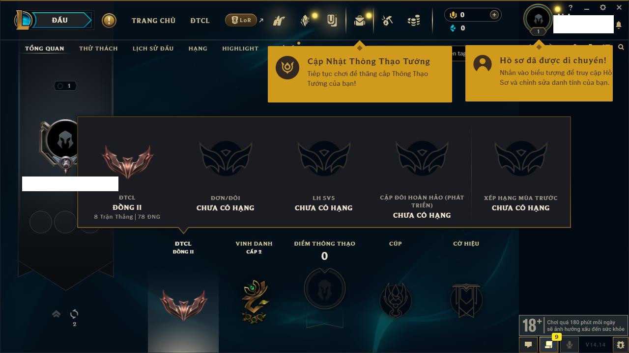 Rank Đơn: Chưa rank mùa nàoKhung: Chưa có khungTướng: 0 - Còn 0 THXTrang Phục: 0Rank ĐTCL: Chưa RankLinh Thú: 6