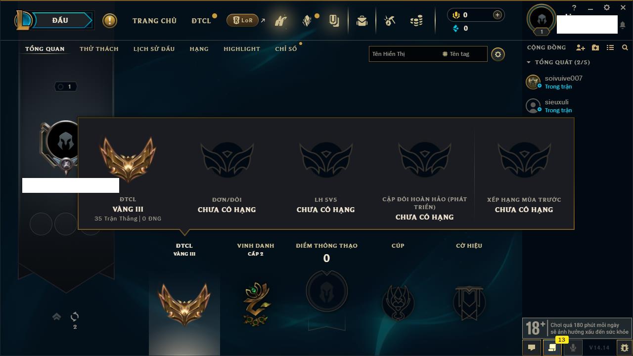 Rank Đơn: Chưa rank mùa nàoKhung: Chưa có khungTướng: 0 - Còn 0 THXTrang Phục: 0Rank ĐTCL: Chưa RankLinh Thú: 13