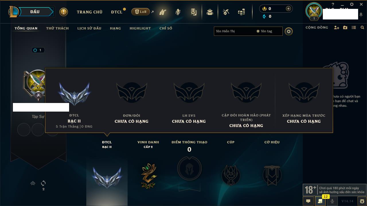 Rank Đơn: Chưa rank mùa nàoKhung: Chưa có khungTướng: 0 - Còn 600 THXTrang Phục: 0Rank ĐTCL: Chưa RankLinh Thú: 19