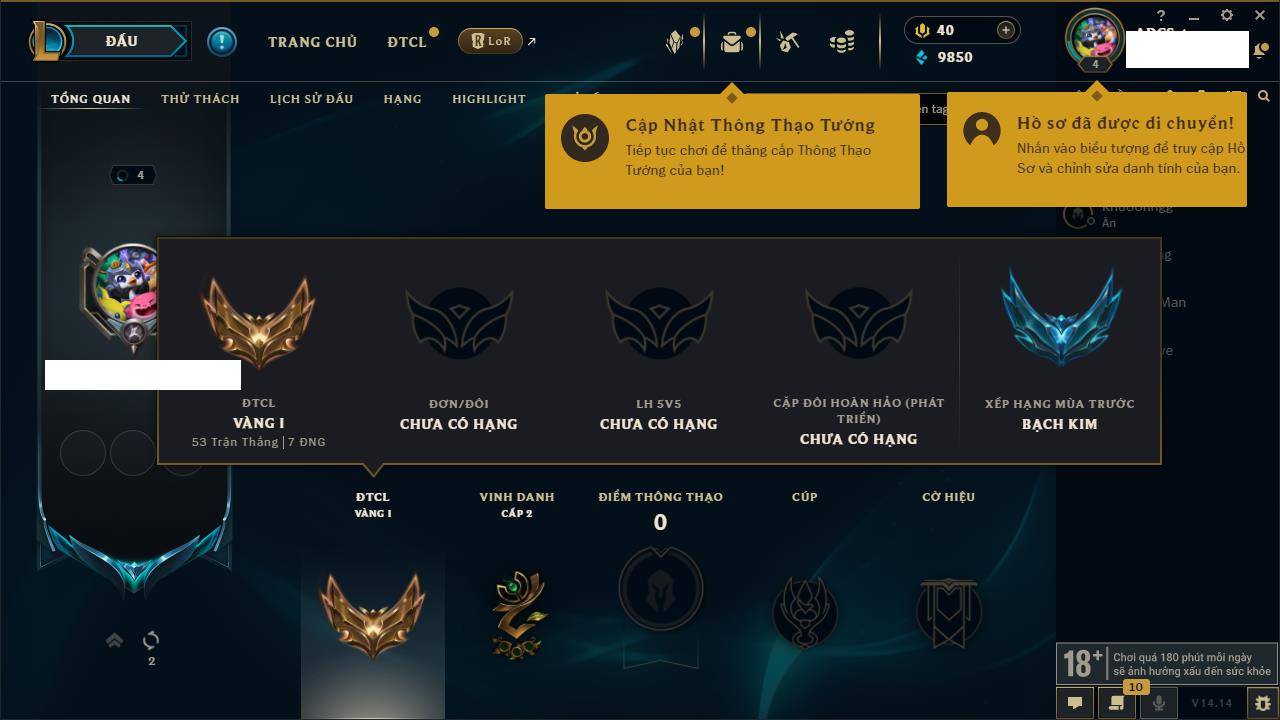 Rank Đơn: Vàng IIIKhung: BạcTướng: 171 - Còn 101359 THXTrang Phục: 88Rank ĐTCL: Kim Cương IVLinh Thú: 200