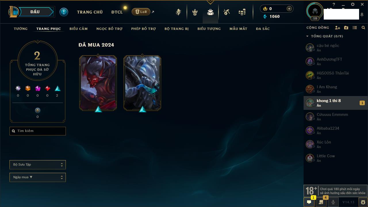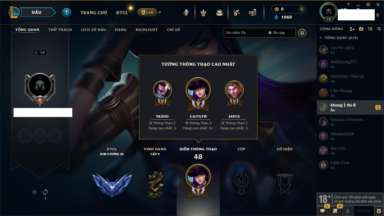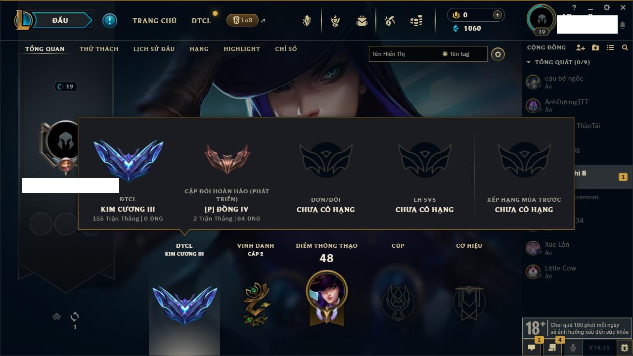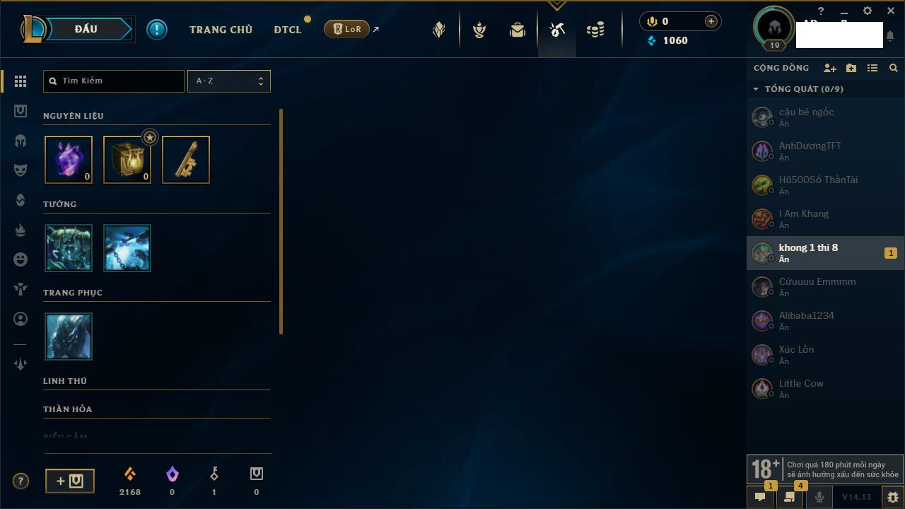 Rank Đơn: Vàng IIIKhung: BạcTướng: 171 - Còn 101359 THXTrang Phục: 88Rank ĐTCL: Kim Cương IVLinh Thú: 200
