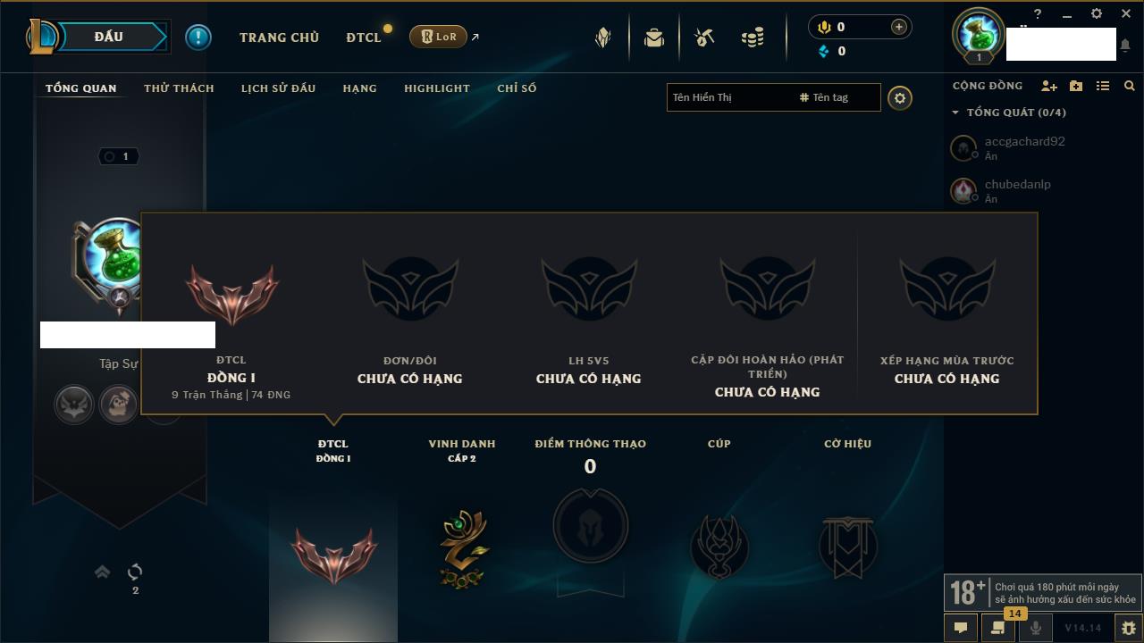 Rank Đơn: Chưa rank mùa nàoKhung: Chưa có khungTướng: 0 - Còn 6299 THXTrang Phục: 0Rank ĐTCL: Chưa RankLinh Thú: 8
