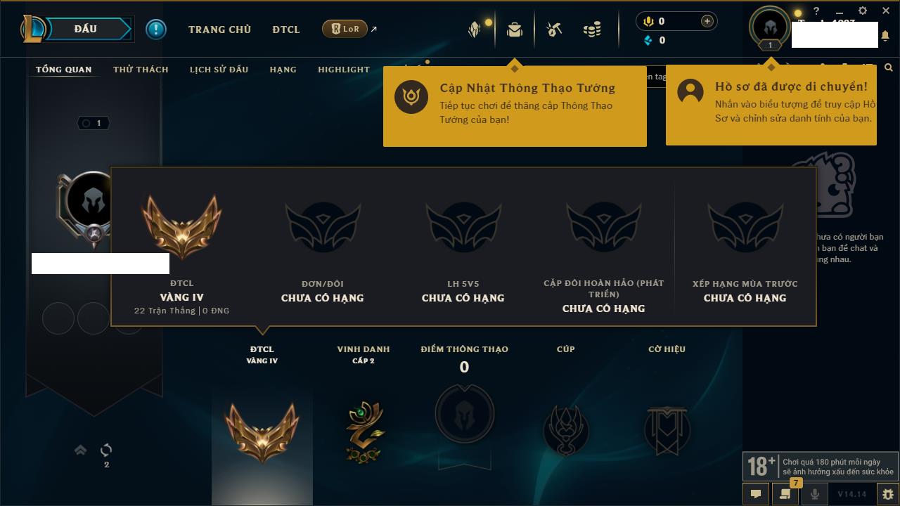 Rank Đơn: Chưa rank mùa nàoKhung: Chưa có khungTướng: 0 - Còn 7200 THXTrang Phục: 0Rank ĐTCL: Chưa RankLinh Thú: 11