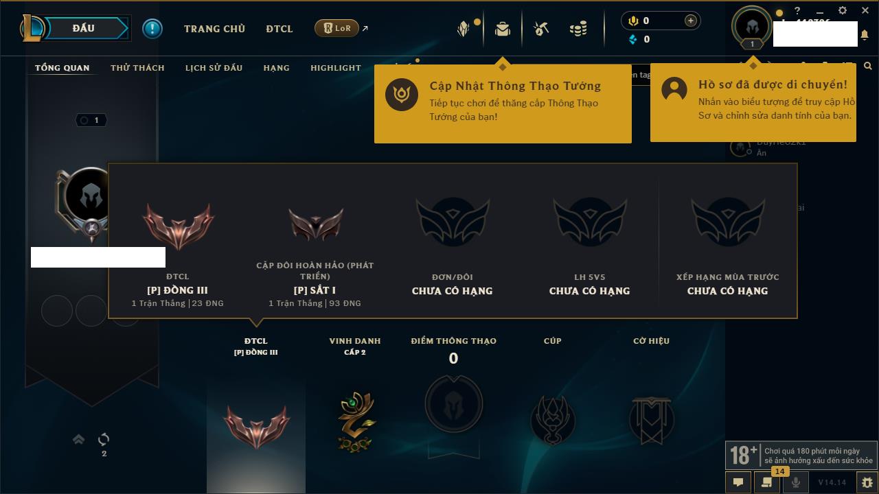 Rank Đơn: Chưa rank mùa nàoKhung: Chưa có khungTướng: 0 - Còn 6299 THXTrang Phục: 0Rank ĐTCL: Chưa RankLinh Thú: 8