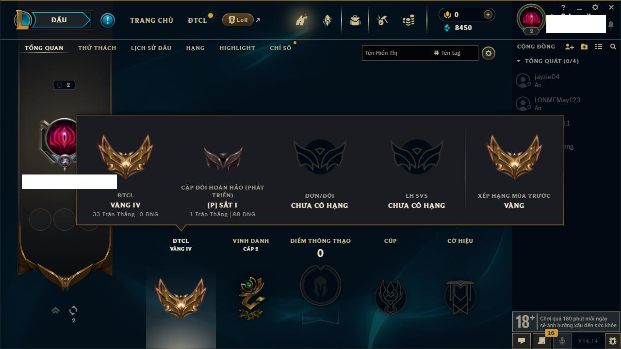 Rank Đơn: Chưa rank mùa nàoKhung: Chưa có khungTướng: 1 - Còn 8450 THXTrang Phục: 0Rank ĐTCL: Chưa RankLinh Thú: 33