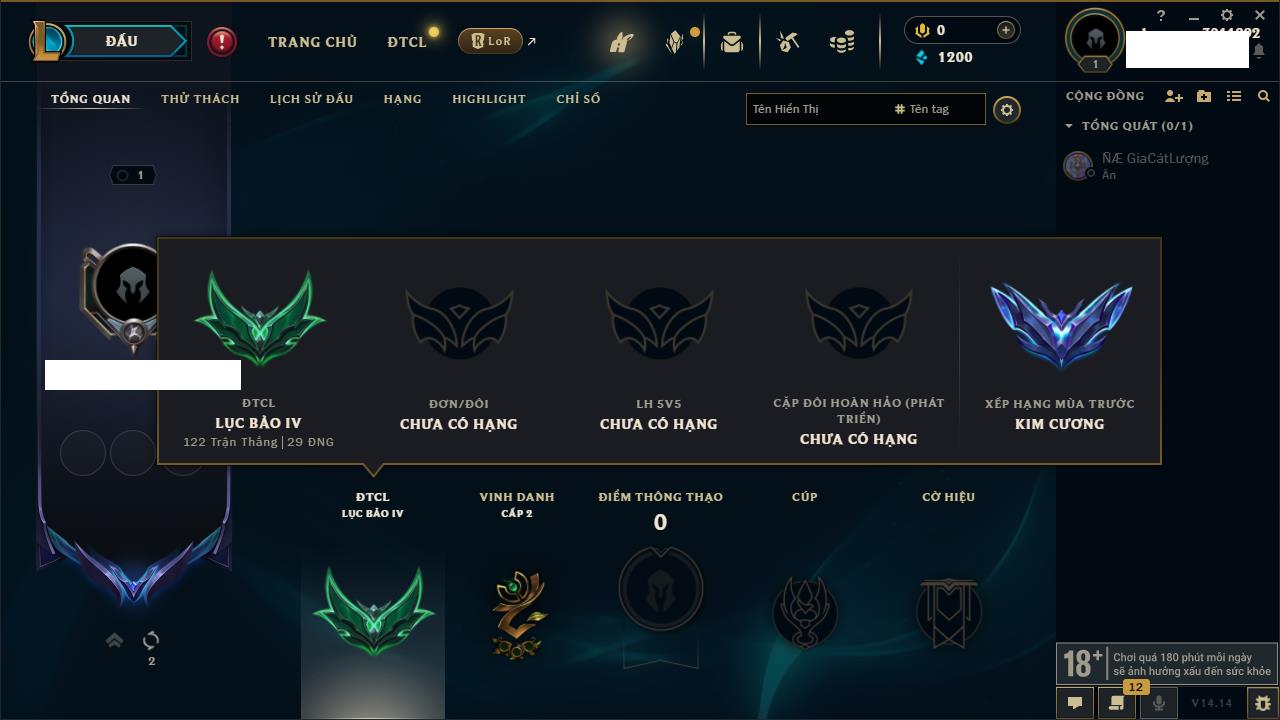 Rank Đơn: Chưa rank mùa nàoKhung: Chưa có khungTướng: 0 - Còn 600 THXTrang Phục: 0Rank ĐTCL: Chưa RankLinh Thú: 21