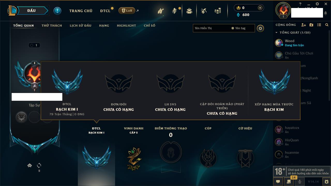 Rank Đơn: Chưa rank mùa nàoKhung: Chưa có khungTướng: 0 - Còn 600 THXTrang Phục: 0Rank ĐTCL: Chưa RankLinh Thú: 33