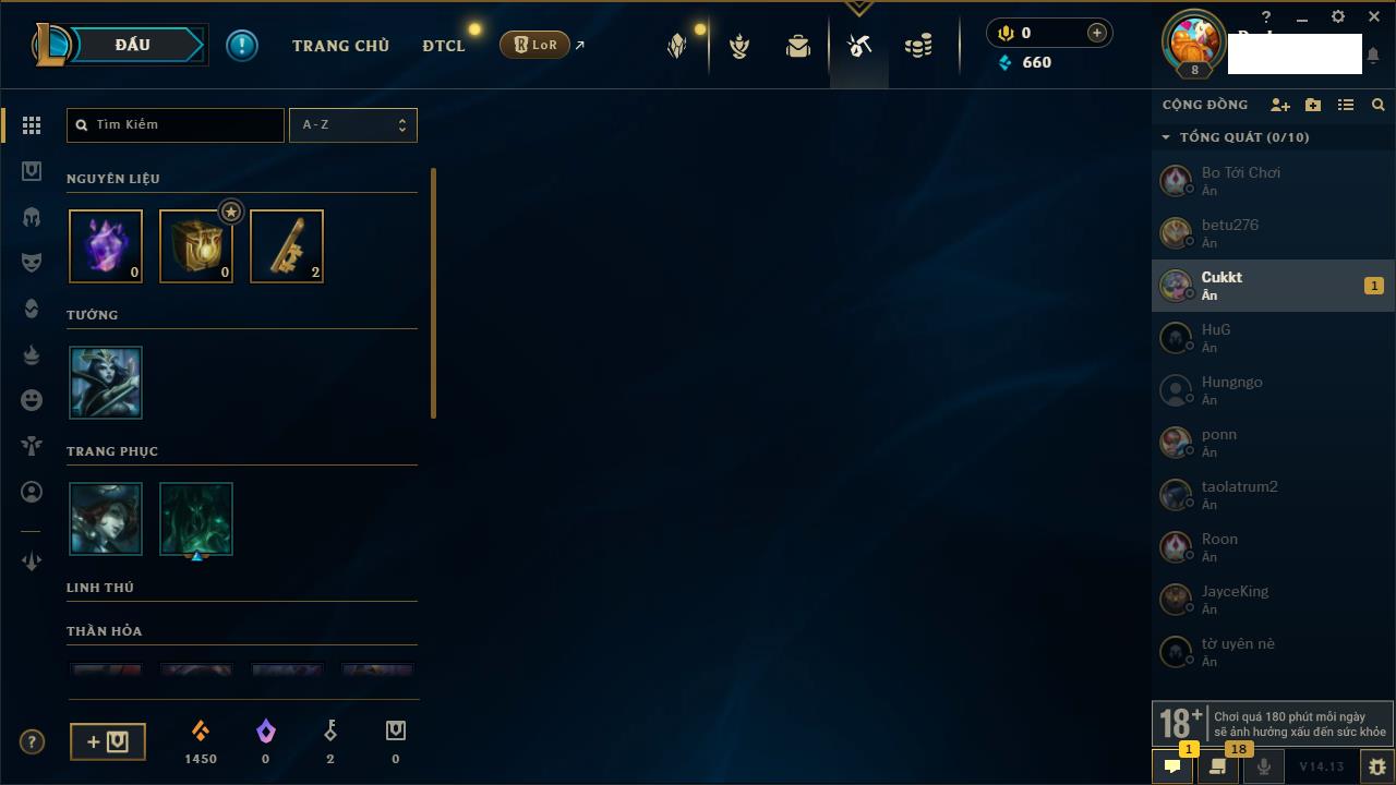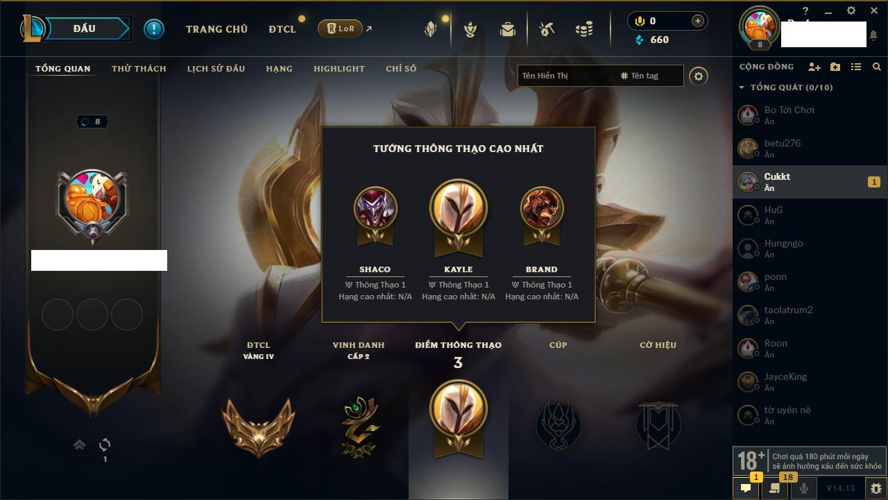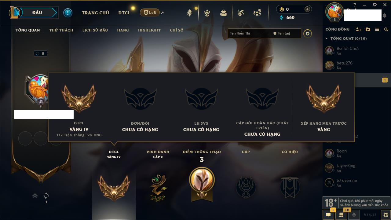 Rank Đơn: Chưa rank mùa nàoKhung: Chưa có khungTướng: 0 - Còn 3000 THXTrang Phục: 0Rank ĐTCL: Bạch Kim IVLinh Thú: 11
