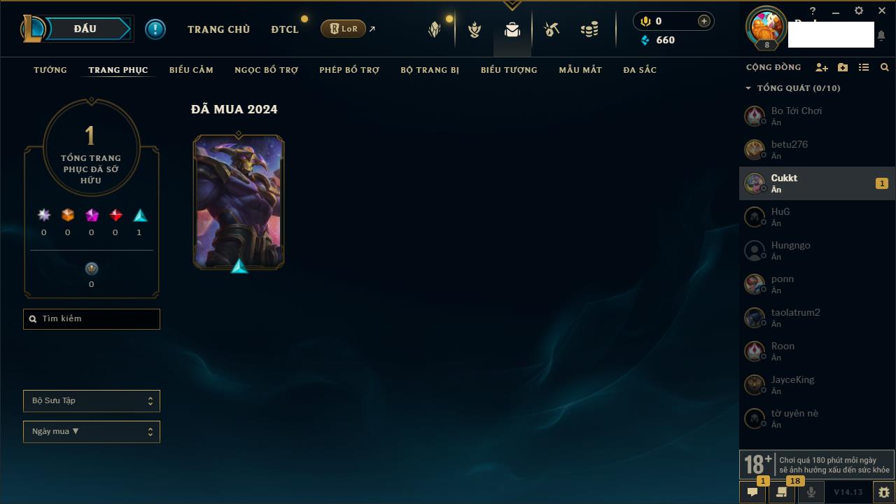 Rank Đơn: Chưa rank mùa nàoKhung: Chưa có khungTướng: 0 - Còn 7200 THXTrang Phục: 0Rank ĐTCL: Chưa RankLinh Thú: 11