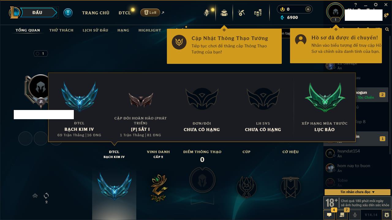 Rank Đơn: Chưa rank mùa nàoKhung: Chưa có khungTướng: 0 - Còn 6299 THXTrang Phục: 0Rank ĐTCL: Chưa RankLinh Thú: 8