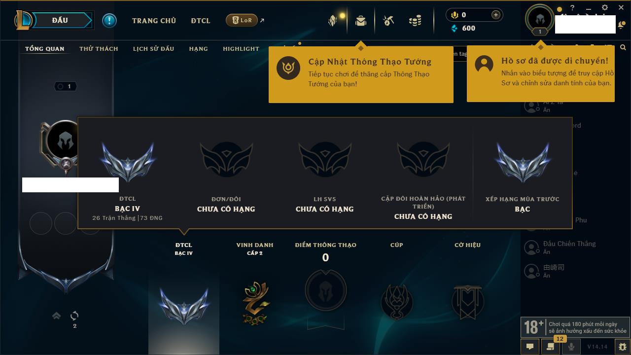 Rank Đơn: Chưa RankKhung: Chưa có khungTướng: 118 - Còn 13712 THXTrang Phục: 117Rank ĐTCL: Chưa RankLinh Thú: 34