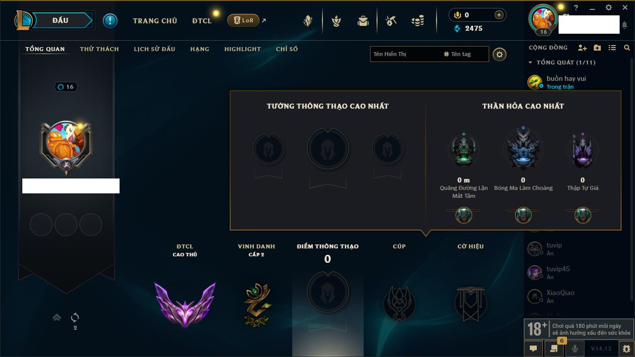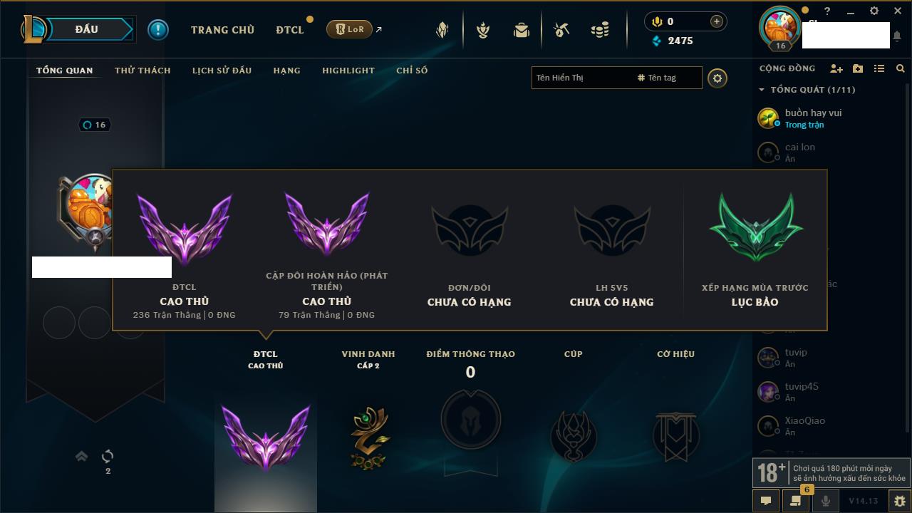 Rank Đơn: Bạch Kim IIKhung: Bạch kimTướng: 171 - Còn 316137 THXTrang Phục: 89Rank ĐTCL: Bạch Kim IIILinh Thú: 94
