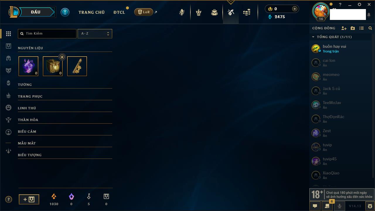 Rank Đơn: Vàng IIIKhung: VàngTướng: 172 - Còn 164704 THXTrang Phục: 255Rank ĐTCL: Kim Cương IVLinh Thú: 156