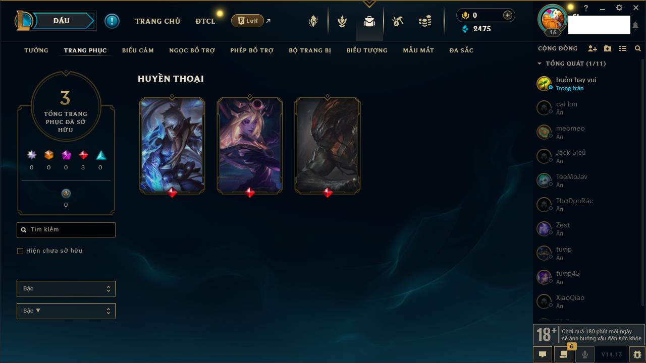 Rank Đơn: Bạch Kim IIIKhung: Bạch kimTướng: 171 - Còn 136108 THXTrang Phục: 261Rank ĐTCL: Bạc IVLinh Thú: 73