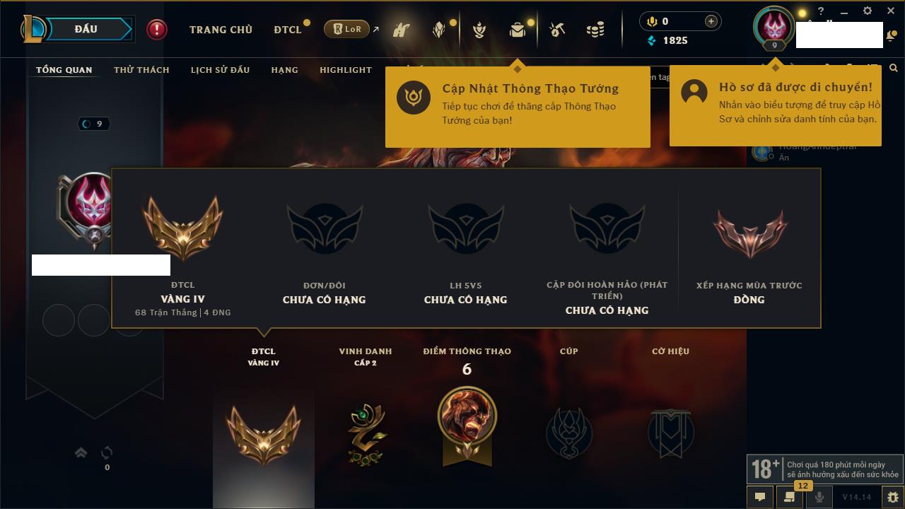 Rank Đơn: Chưa rank mùa nàoKhung: Chưa có khungTướng: 4 - Còn 12000 THXTrang Phục: 0Rank ĐTCL: Bạch Kim IIILinh Thú: 20